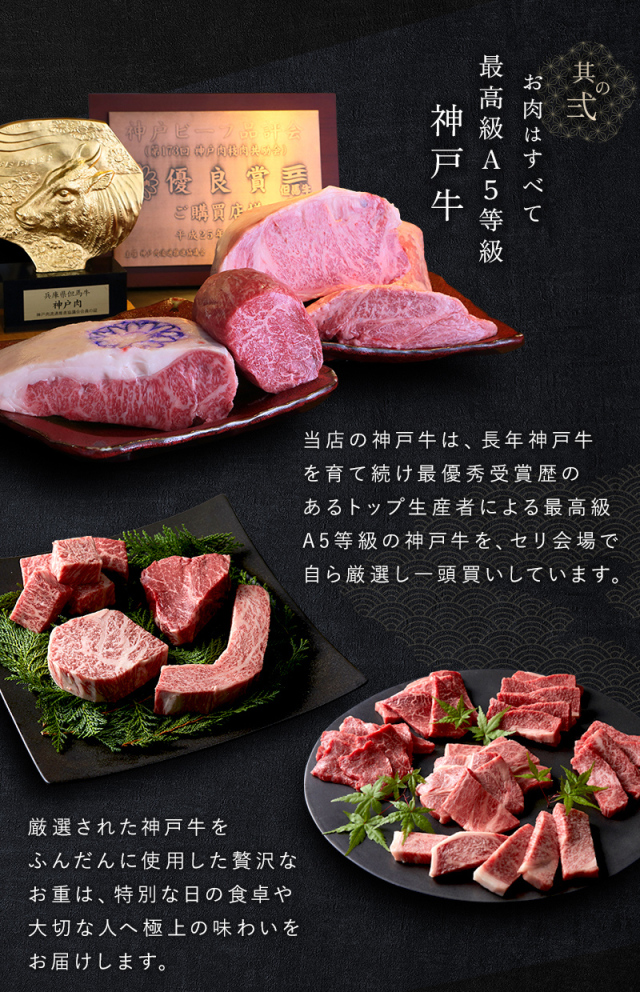 | 商品情報 | 贅を重ねて、気品を贈る二段重 「特別な日に、とびきりのご馳走を」 そんな想いを叶えるため、厳選された最高級A5等級神戸牛を贅沢に使用した神戸牛食べ比べお重をご用意しました。 二段重は、贅沢さを凝縮した上品な贈り物。 焼肉・すきやき・ステーキからお好みの二種を組み合わせ華美すぎず、気品ある贈り物に最適です。 とろけるような食感と口の中に広がる芳醇な味わい。 極上の神戸牛を心ゆくまで堪能できる「お重」。 特別な日の食卓に、大切な方への贈り物にぜひご利用ください。 |
