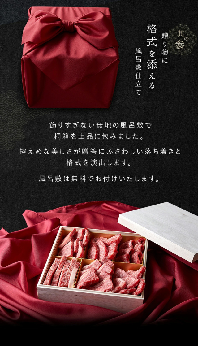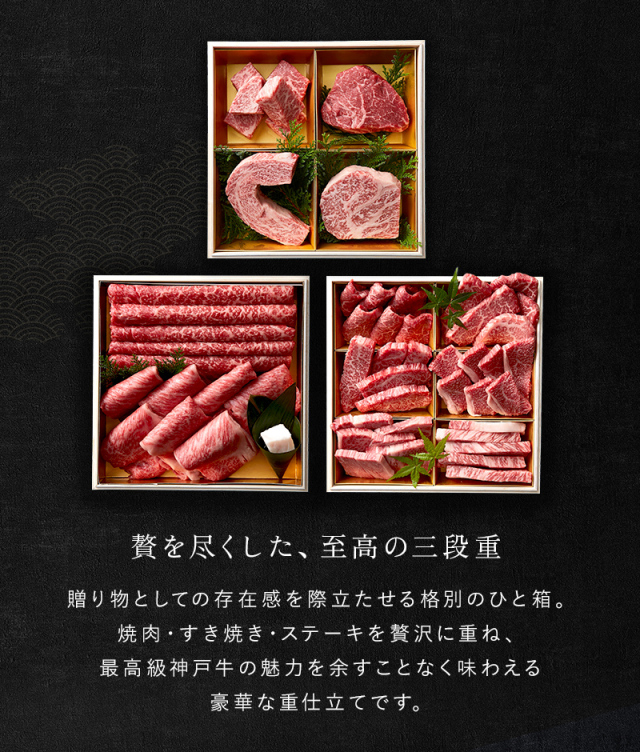 贅を尽くした、至高の三段重 「特別な日に、とびきりのご馳走を」 そんな想いを叶えるため、厳選された最高級A5等級神戸牛を贅沢に使用した神戸牛食べ比べお重をご用意しました。 贈り物としての存在感を際立たせる格別のひと箱。 焼肉・すき焼き・ステーキを贅沢に重ね、最高級神戸牛の魅力を余すことなく味わえる豪華な重仕立てです。 とろけるような食感と口の中に広がる芳醇な味わい。 極上の神戸牛を心ゆくまで堪能できる「お重」。 特別な日の食卓に、大切な方への贈り物にぜひご利用ください。 |