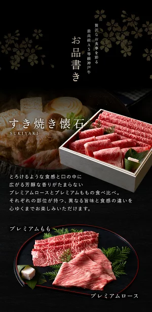 | 商品情報 | 「特別な日に、とびきりのご馳走を」 そんな想いを叶えるため、厳選されたA5ランク神戸牛を贅沢に使用した 「神戸牛づくし重 すき焼き」をご用意しました。 自慢は、とろけるような食感と、口の中に広がる芳醇な香りがたまらない、 プレミアムロースとプレミアムももの食べ比べ。 それぞれの部位が持つ、異なる旨味と食感の違いを心ゆくまでお楽しみいただけます。 |